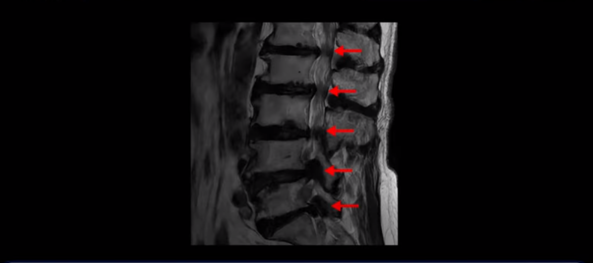 이 환자분은 MRI로 보면 허리 여러 마디가 신경이 매우 심하게 눌려 보이는 분입니다. 이분 MRI를 보면서 간단히 설명해 드린 후 어떻게 이렇게 신경이 심하게 눌린 환자분이 수술 없이 근육신경재활치료로 좋아질 수 있는지, 다리가 아파 걷지 못하는 환자가 어떻게 안 아프고 잘 걸을 수 있게 되는지, 10년 동안 괴로웠던 양 발의 시린 증상은 어떻게 사라질 수 있는지, 치료는 어떻게 하는지 자세히 설명 드리겠습니다.