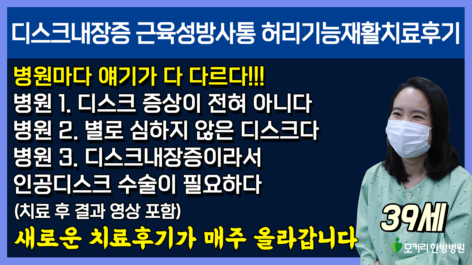 저희 모커리한방병원은 디스크내장증은 정말 잘못된 진단이며 디스크 문제가 아닌 허리 기능의 문제, 특히 근육, 인대, 힘줄의 경직이나 미세한 손상에 의한 기능적 이상이 원인이고 굳이 현존하는 진단명에서 찾는다면 아주 심한 형태의 근막통증증후군에 훨씬 더 가깝다고 말씀 드리고 있습니다. 그래서 혹시라도 디스크내장증 진단을 받으신 분들은 자세히 보시면서 왜 아픈 건지, 치료는 어떻게 하고 관리는 어떻게 해야 하는 건지 자세히 보시길 바랍니다.