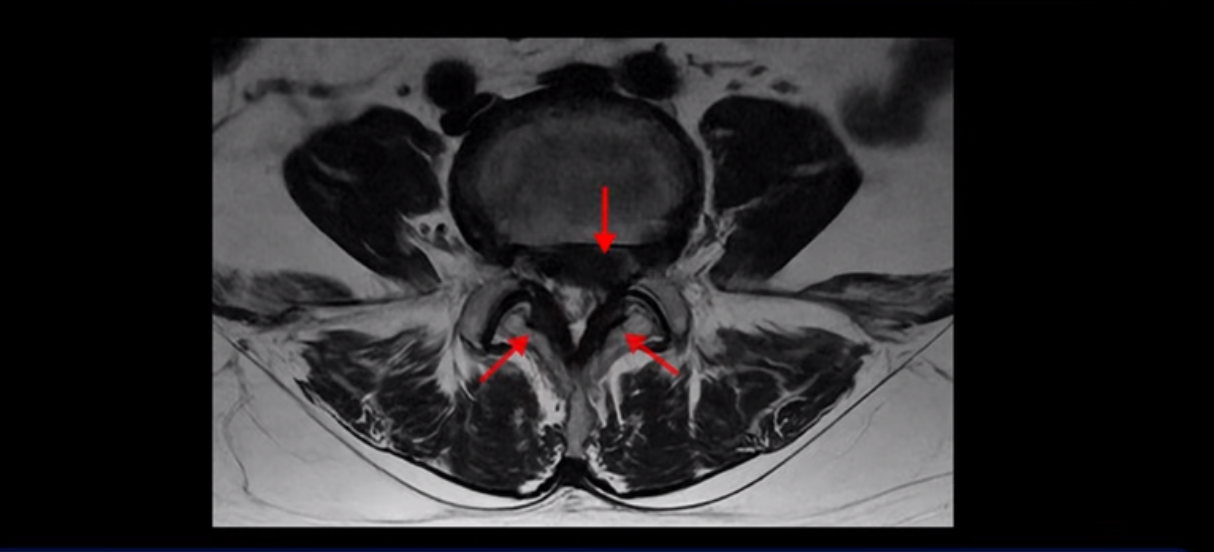 앞에서는 디스크 수핵이 신경 공간으로 침범하고 뒤에서는 두꺼워진 인대가 신경 공간을 좁히고 있습니다.
