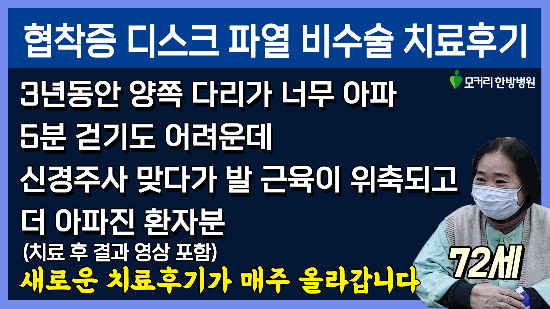 나는 이제 정형외과에 가면 안 되겠구나. 그렇게 주사를 맞고 나서 점점 더 아파지고 너무 힘이 드니까 그러다가 ‘나는 한의원에 다니면서 치료해야겠구나’ 하는 와중에 모커리 원장님 유튜브를 본 거예요. 유튜브를 보고 ‘원장님 본인이 아프셨으면 아픈 사람의 심정을 알겠구나’ 하고 그걸 보다가 척추전문 한방병원이 있구나 알게 됐어요. 한방 척추전문이면 다른 병원하고 차별화가 됐을 것 같고 모커리만의 노하우가 분명히 있을 것 같았어요. 치료후기도 많이 봤는데 저분들이 거짓말은 아니겠구나라는 그 진실성이 보였어요.