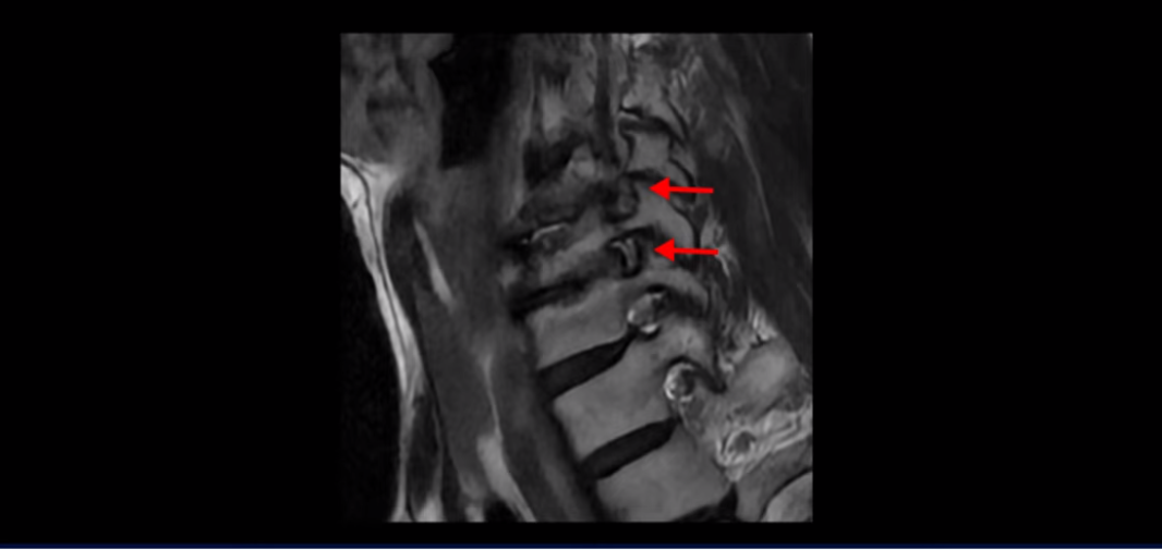 MRI를 보면 2마디 디스크의 퇴행이 아주 심해 보입니다.