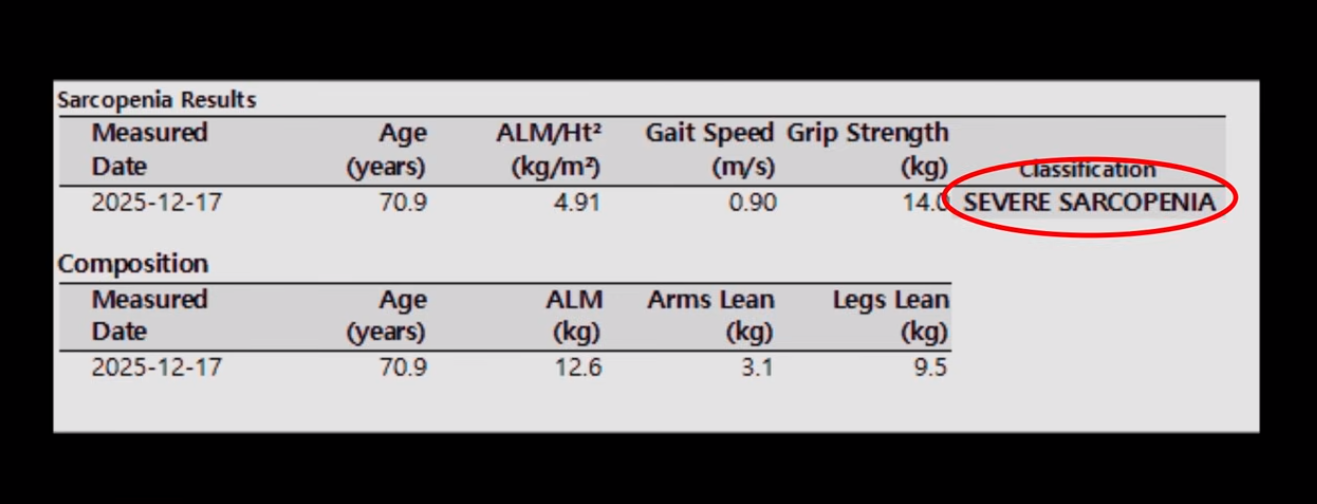 이 기립근은 허리를 펴주는 근육인데 이렇게 문제가 생기면 허리가 구부러집니다. 또한 이분의 근육 상태를 알 수 있는 근감소증 검사에서 중증 근감소증 진단이 나왔습니다.